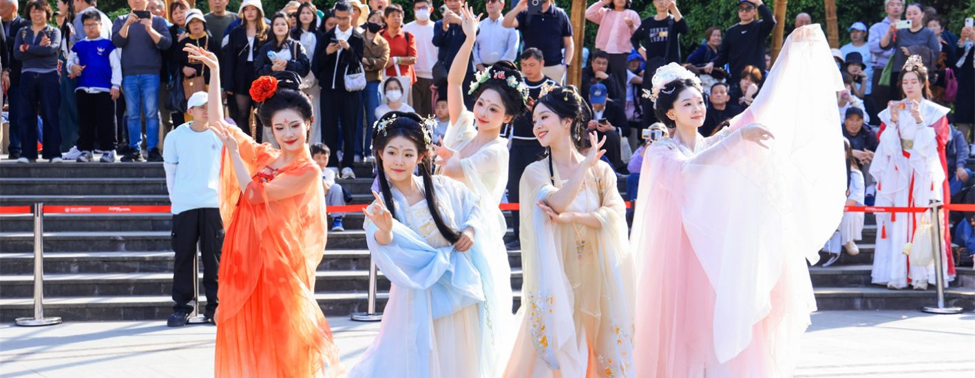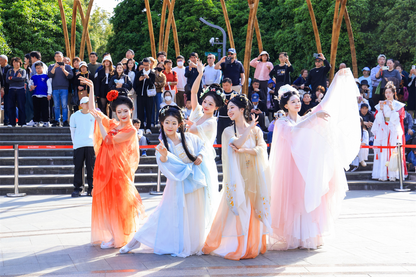 更添一抹东方雅韵的是,五一期间,“花神”巡游将翩然而至。头戴花冠、身披霓裳的花神们衣袂飘飘,宛如从古画中走来。一路从古城公园巡游至BFC北区广场,在春日的微风中上演一场震撼视觉的东方浪漫群舞,将古典花神的灵动与温婉定格在外滩的现代肌理之中。