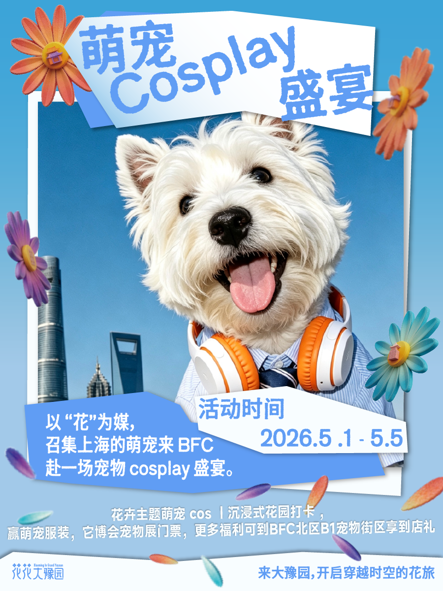 BFC的五一不仅是人类的乐园,更是萌宠们的天堂。作为沪上人宠友好地标,BFC北区B2小花园在5月1日至3日将举办 “花漾萌宠春日变装派对”。无论你是提前在家装扮,