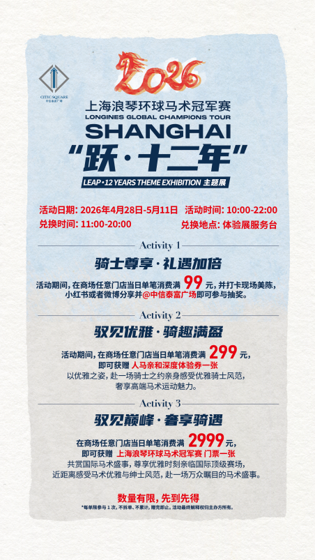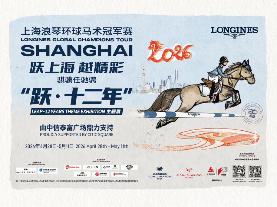 2026年赛事将于5月1日至3日在上海久事国际马术中心精彩上演;配套“跃・十二年”主题展于4月28日至5月11日在静安区中信泰富广场亮相,近两年的浪琴马术比赛相关主题展均落地中信泰富广场,本次展览是马术文化与中信泰富广场的又一次深度联动,展览联动商圈与城市公共空间,营造全城跃马的浓厚节日氛围,以十二年赛事经典记忆,唤醒城市与马术的共同回忆。
