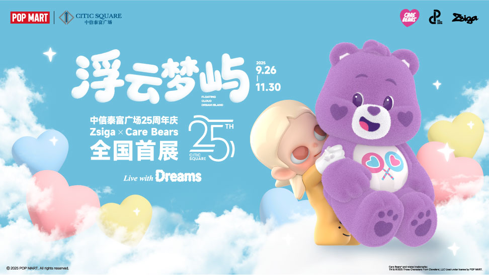 长久以来,中信泰富广场始终致力于打造精致、格调与潮流的生活方式。此次携手POP MART举办浮云梦屿Zsiga X Care Bears 全国首展,正是商场风格的自然延续,匠心打造出的沉浸式空间“浮云梦屿”令人耳目一新。
