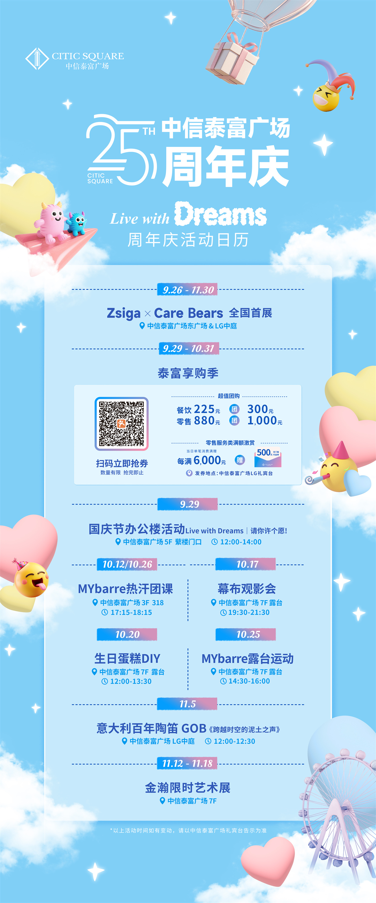 中信泰富广场25周年庆正式启幕。Live with Dreams主题派对暨POP MART快闪店开幕式渲染出梦幻氛围感,一场潮流融汇的盛宴在“梦剧场”随之上演:POP MART旗下高人气原创IP形象Zsiga联动全球潮流ICON Care Bears,在中信泰富广场举办Zsiga X Care Bears全国首展,“浮云梦屿”发出限时召集令,即将打开现实版寻梦环游记;周年庆期间,商场入驻品牌纷纷蓄势待发,巧妙融合跨界灵感,碰撞出多元体验,共赴一场美学盛宴。中信泰富广场与所有逐梦者携手同行,一同见证这一重要时刻,并以非凡礼遇再启全新征程。