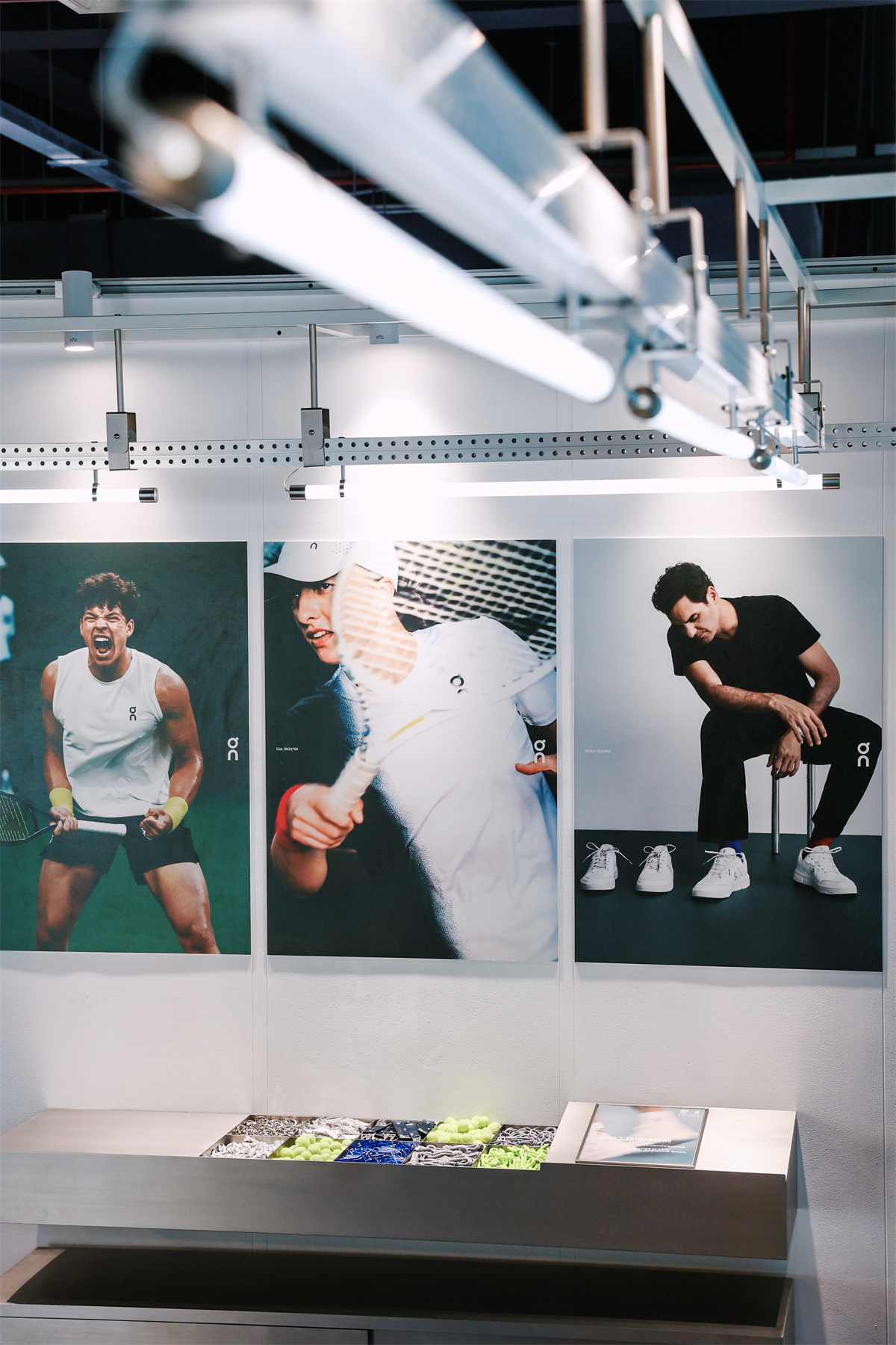 屏幕上滚动播放着 On昂跑 签约球员的精彩瞬间:大满贯得主 伊加·斯维亚泰克、美国新星 本·谢尔顿,以及作为On昂跑联合创业者参与到品牌网球事业方方面面的瑞士网球传奇罗杰·费德勒。签到打卡,现场球迷还有机会将球星的巨幅海报带回家。