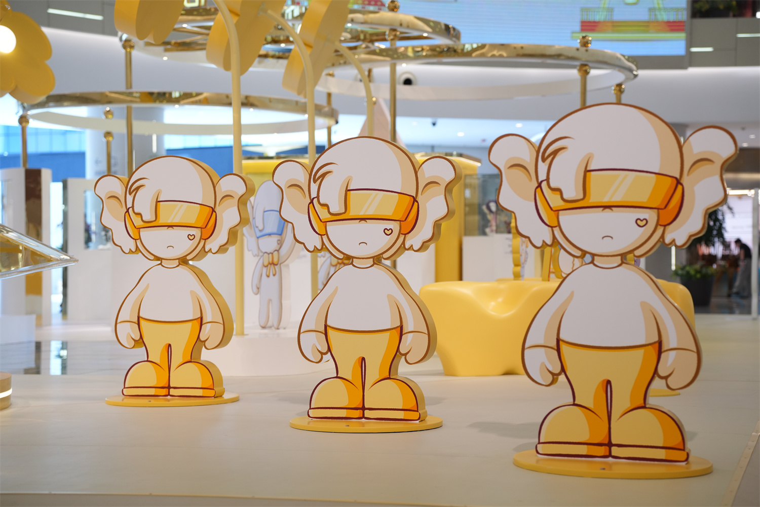 步入纵深处,一条花瓣廊道温柔展开。脚下的LED屏如流动的魔法画布,每一步都能踩出细碎星光。廊道两侧,八朵淡黄色花朵静立,花茎弯向中央似暖黄羽翼,每朵花外侧都立着一只造型各异的Marsper公仔,身姿与花茎相依而立,如同打造梦境的魔法精灵。而站立在仿真奶酪上的蓝黄双色公仔裹着缀饰的魔法帽,灵动又可爱,化身 “潮酷守护者”。踏入廊中,星光漫过奶酪底座,瞬间被这份藏着细节的温柔包裹,跌进爱与魔法交织的潮酷氛围里。