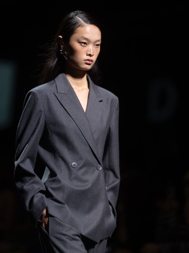 材质拼贴、激光镂空花与不对称出芽条的时装设计语⾔点亮了时装系列。酒红⾊哑光PU半裙呈现出低调的光泽感,激光切割的⽴体花朵为之赋予层次感与动态美;⽩⾊丝⽑提花与不对称出芽条结合,打破规律,形成⾃然随性的节奏;⽽⽩⾊全⽺⽑⾯料在⻔襟与开叉处拼接单⾯缎醋酸纤维,令双⾯呢的厚重与缎⾯的光泽形成鲜明对⽐,在经典廓形中融⼊亮丽的现代⽓息。