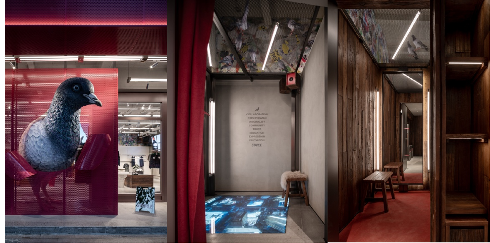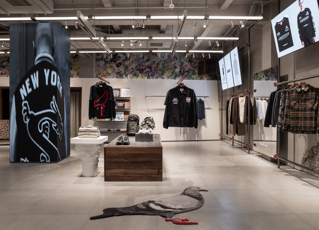 此次上海品牌旗舰店以“城市观察者”为概念,巧妙地将纽约城市工地的工业脚手架元素与上海老城区的文化肌理相融合,打造与本土消费者建立深刻链接的零售空间。店铺设计中还引入了“鸽子”主题装置与“鸽子屋”空间,赋予消费者“鸟类视角”,引导其沉浸式体验东西方街头文化的深度碰撞。