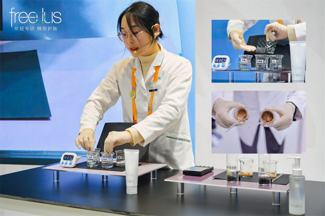 在其发表的《氨基酸技术在清洁体系中的创新研究与应用》主题演讲中,详细介绍了品牌基于氨基酸技术的三款洁卸产品创新,并在另外两位研究员的现场实验配合下,动静结合地生动呈现了氨基酸技术的含“净”量。其中,“高浓度氨基酸蛋白质反应实验”直观地为现场观众展示了氨基酸系晶析配方对肌肤角质层的保护作用,从而体现芙丽芳丝氨基酸系洁面的“温和洗净,不易对肌肤角质层造成伤害”的产品特性。其中,净澈控油洗面霜就是在此基础上,首次将天然微米级赤岩火山泥与88%高浓度氨基酸表活Ⅰ复配,并通过双甘油成分降低体系热敏感性,解决了高温环境下的配方稳定难题,成为了氨基酸配方上的一次成功革新。而“氨基酸系油彩妆融合实验”则展现了其进博首秀新品——氨基酸系净润精华卸妆油“秒速Ⅲ溶妆,温和无负担且高效卸净”的硬实力。