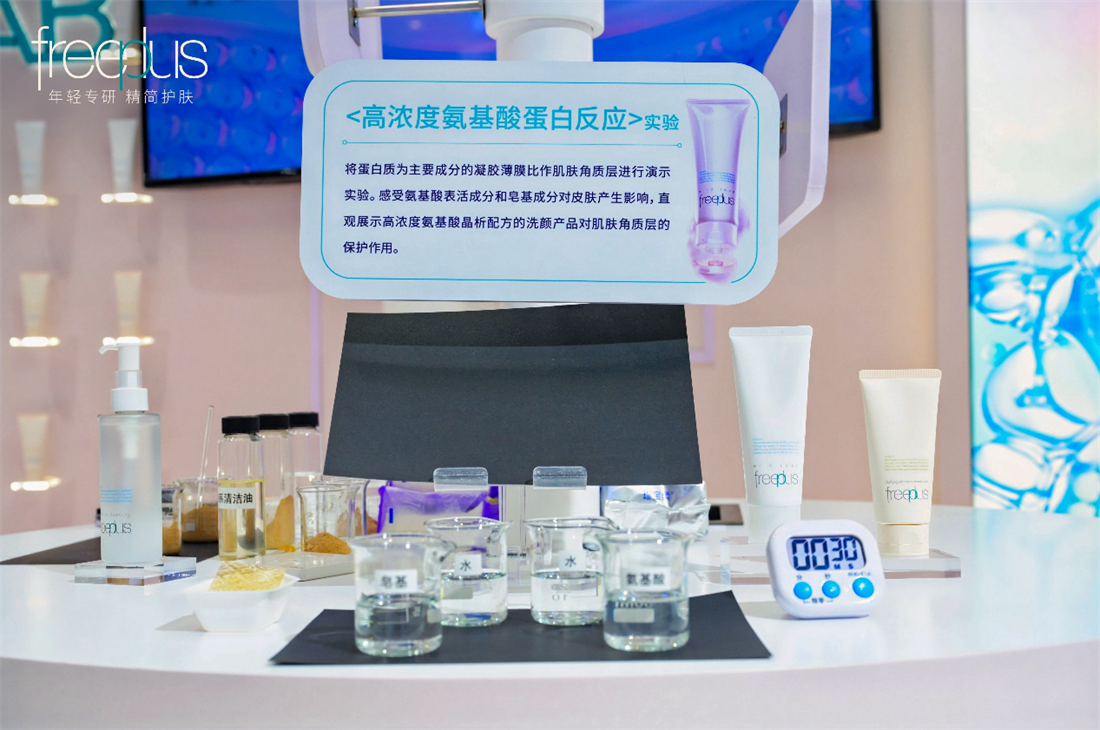 本次芙丽芳丝展台的整体设计一改传统的陈列风格,化身为一间开放式的科普实验室。其核心目的在于实现“科研可视化,价值可感知”,让每一位参观者都能在互动中理解品牌坚守40年对氨基酸成分的钻研。从氨基酸的“身世之谜”,到独家定义的“肌源氨基酸”成分,再到“专研晶析技术”实现88%高浓度氨基酸Ⅰ的创新应用,展区通过集视觉、听觉、触觉与互动于一体的沉浸式体验空间,让深奥的技术原理和品质可以看得见、摸得着。
