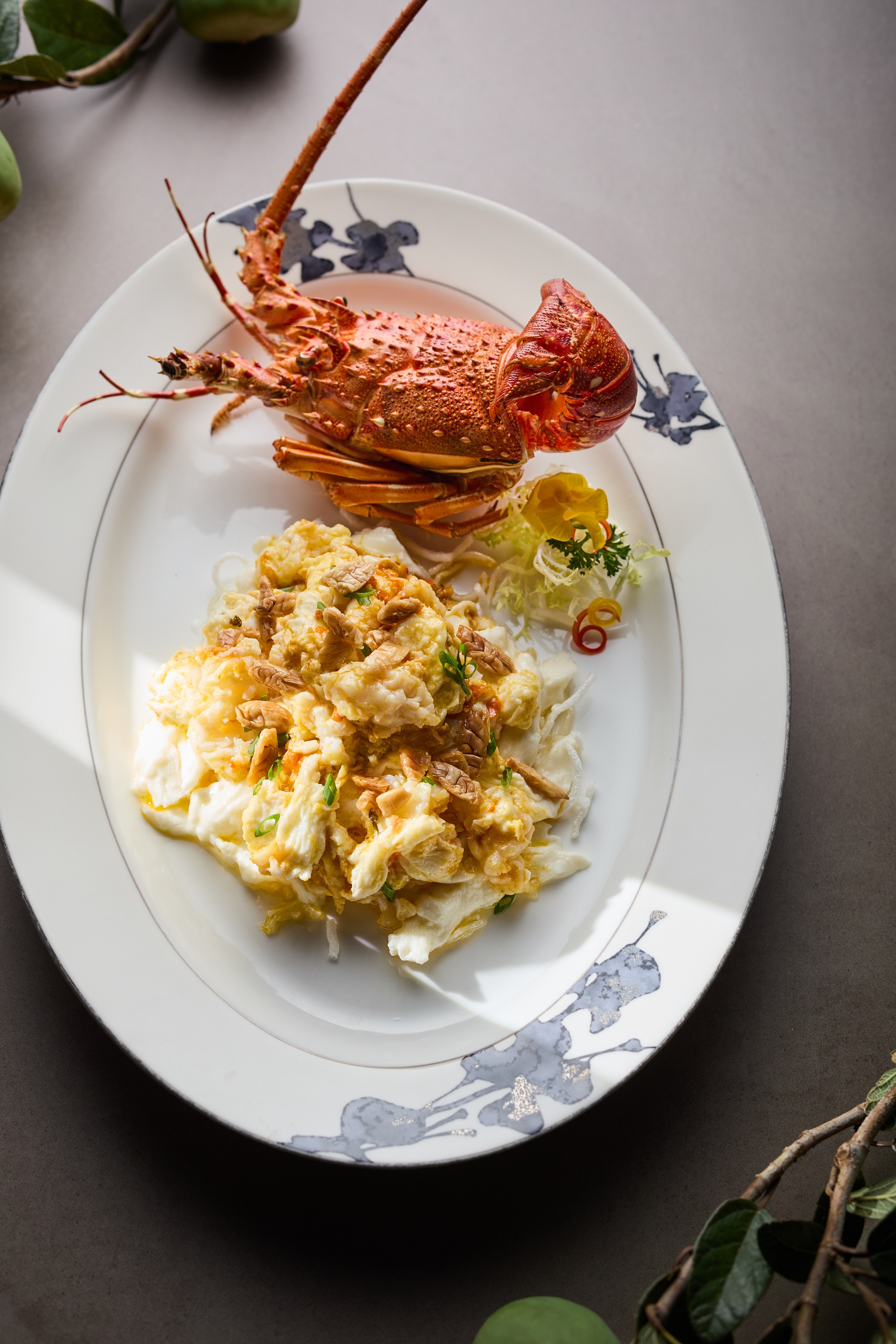 而拆蟹皇炒龙虾鲜奶无疑是餐席上的视觉与味觉焦点。取鲜活龙虾现拆,鲜嫩蟹肉与手工慢搅的蛋清充分交融,再投入饱满蟹皇火速快炒。蛋白如凝脂莹白,龙虾似玉肌粉嫩,蟹黄若流金璀璨,三色辉映间,恰似一幅秋日温润画卷铺展于餐盘。入口时,乳香、虾鲜、蟹黄的丰韵层层递进,让味觉与视觉的奢雅共鸣直抵心间。