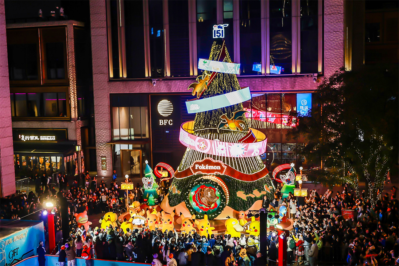 11月22日起,宝可梦的冬日之旅在外滩奇幻开场!全球首棵151主题圣诞树空降BFC北区广场,外滩夜色中,高达15.1米的圣诞树缠绕着一抹红色飘带,亮灯瞬间带来童话般的冬日梦幻氛围。皮卡丘、妙蛙种子、小火龙、杰尼龟等宝可梦一一亮相,