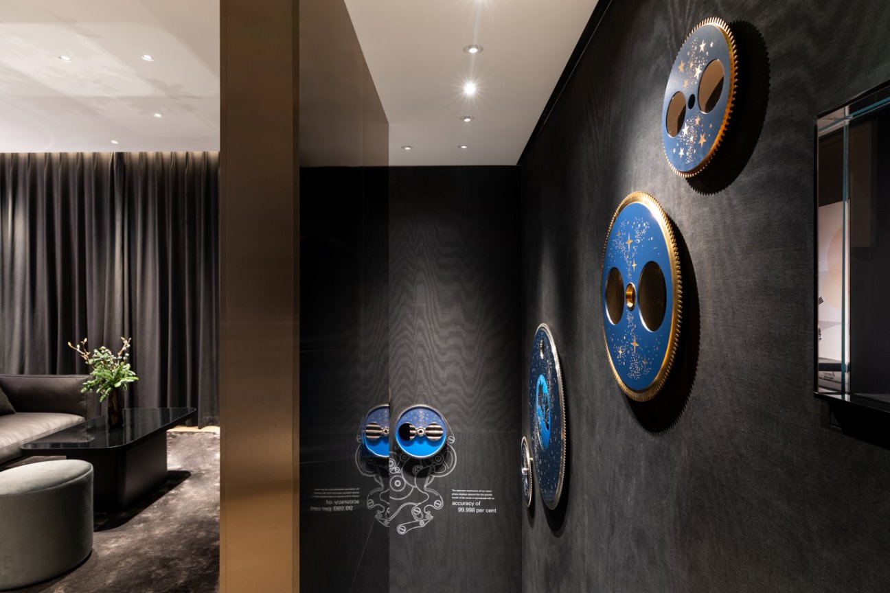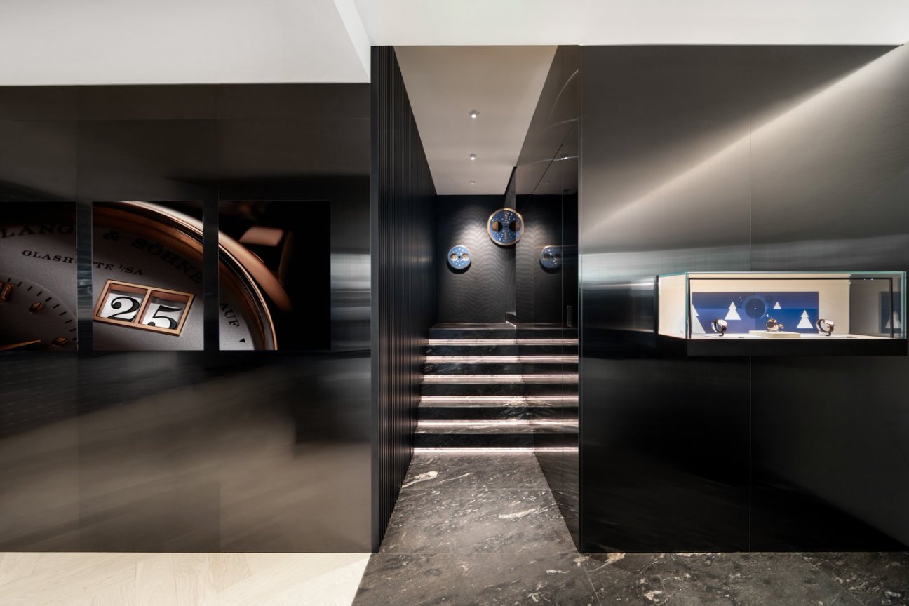 通往二层的楼梯间,墙面嵌着数个立体的月相盘的展示,呈现朗格于不同腕表上所搭载的精巧月相构造,在光与影的交织之下,亦诗意地衔接起下一空间的精彩。旗舰店的二层空间被规划为更为私密与专属的贵宾区域,旨在为资深藏家提供一场深入复杂功能核心的探索之旅。宾客将依次鉴赏朗格在“月相显示”腕表上的诗意美学、在“万年历机制”中展现的永恒追求,以及在“计时码表”领域打造的巅峰性能。同时,多个设计典雅的贵宾尊享区分布其中,确保了咨询与鉴赏的尊贵私密性,亦为宾客提供尊享服务与丰富体验。此外,于店内一隅,朗格还特别设有品牌专属吧台,提供定制化饮品服务,将萨克森的诚挚待客之道融入空间体验。至此,从一楼对制表艺术与历史的全面纵览,到二楼对精密复杂功能的深度剖析,以及多个面向宾客打造的贵宾尊享区和体验服务,朗格全新上海旗舰店构建了一处对萨克森制表腹地的沉浸之旅。品牌深厚的制表文化、制表热忱与精密追求,得以在此分享、碰撞与传承。这一空间更将成为联结朗格藏家与钟表爱好者的重要纽带,于私密雅致的氛围中,畅叙时计艺术,凝聚社群情感。