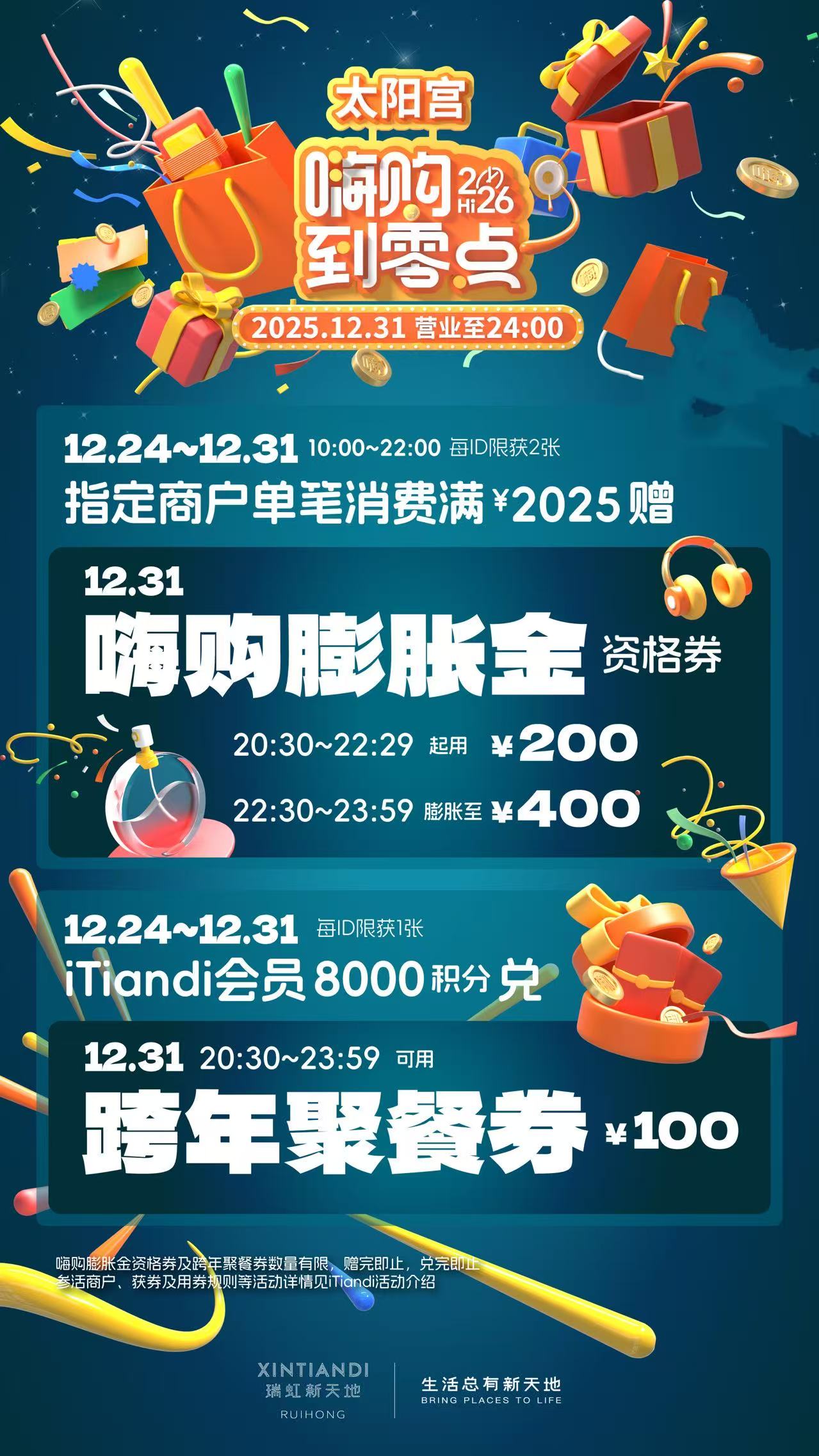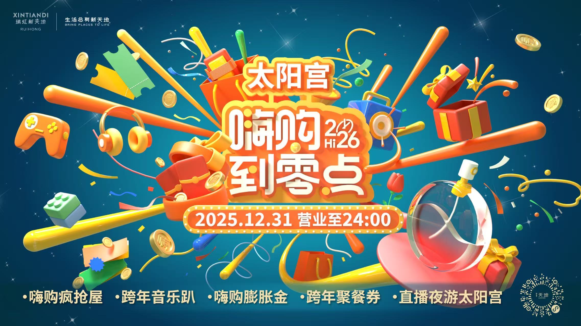 2025年12月31日,瑞虹新天地太阳宫将延时营业至24:00,并以“嗨购到零点”为主题,打造一场集嗨购、限时挑战、音乐趴、云直播于一体的沉浸式跨年狂欢体验。活动从当晚19:00持续至24:00,旨在为广大市民消费者提供一个兼具消费体验与情感联结的跨年新选择。