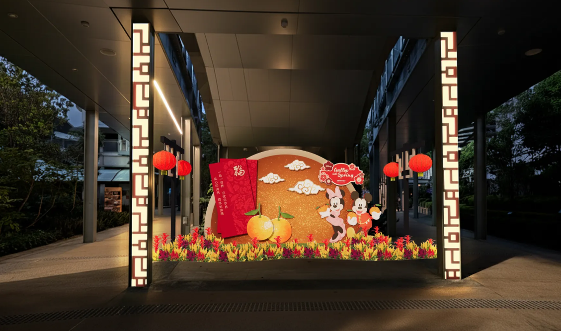 来到【观径】,“八骏迎春”装置将八匹天骏的祝福一一呈现,每匹骏马象征不同的新年愿景,如活力、和谐与新生等。装置由本地艺术家陈有兴(JooHeng Tan) 设计,游客可在米奇主题灯饰板前寻找属于自己的生肖寓意。现场设有互动二维码体验,宾客可扫码获取个性化生肖解析,并下载生肖主题手机壁纸作为纪念。