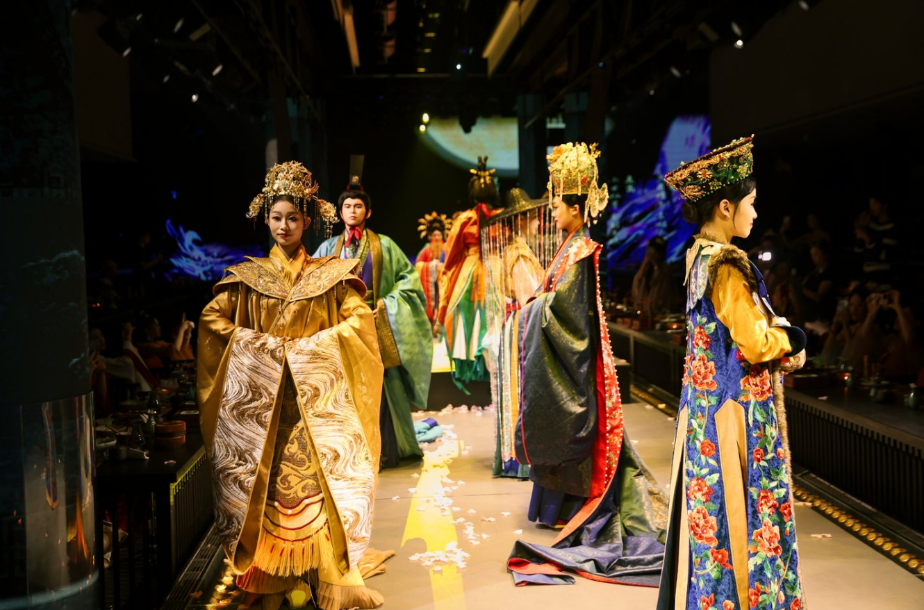 节目诠释:“中国有礼仪之大,故称夏;有服章之美,谓之华。”孔颖达在《春秋左传正义》中以服章之名、礼仪之重诠释“华夏”一词,由此,中华“衣冠上国”的美誉也经世流传。蜀宴赋谢宾之礼的节目冠服典仪《盛世华章》,以青、白、朱、玄、黄以五色说连结五行,隐喻华夏先辈们对于哲学的独特思考。美轮美奂的灯光之下,表演者依所处的时代顺序次第展示各个朝代的服装,带宾客穿越千年冠服典仪,徜徉华夏璀璨历史星河,感受华夏文明服章典仪和服礼脉络。尾声之处,群星归位,大梦醒来,结束一场美好而梦幻的宴饮之旅。