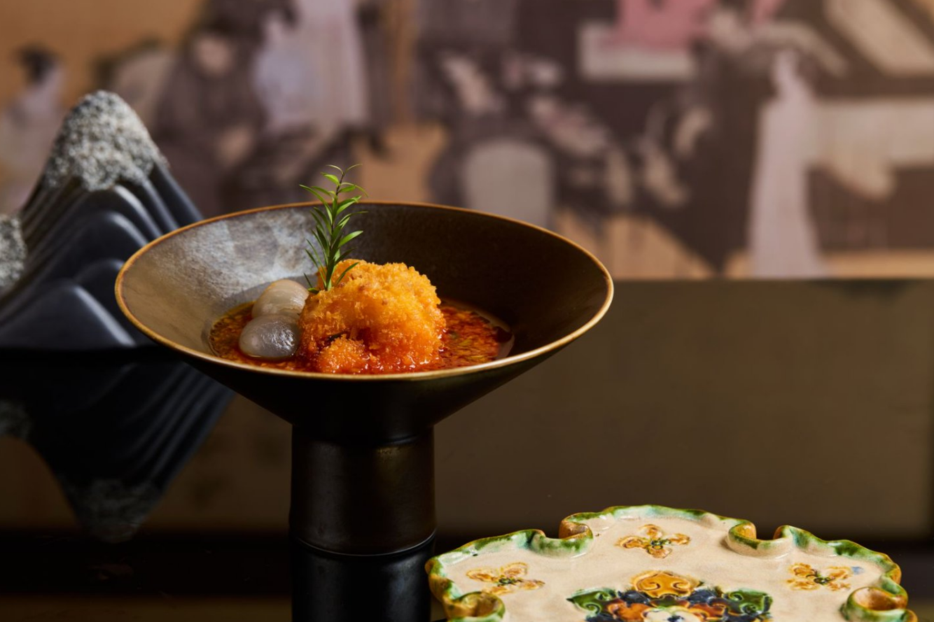 菜品诠释:川菜二十四味之“鱼香味”。龙眼鱼香虾盏,精选大青虾仁,佐以清甜龙眼,酥炸定型。其外金灿酥脆,内里鲜嫩弹牙,再浇以川菜灵魂鱼香汁,酸甜微辣之味瞬间激活味蕾,浓郁香气四溢。此盏妙在其形如丝路珍宝,其味显巴蜀风韵,仿佛一件沿丝路而来的异域奇珍,献于大唐盛宴,形色巧妙融合,数味争而不艳,尽显盛唐海纳百川、和和而美的恢弘气度。