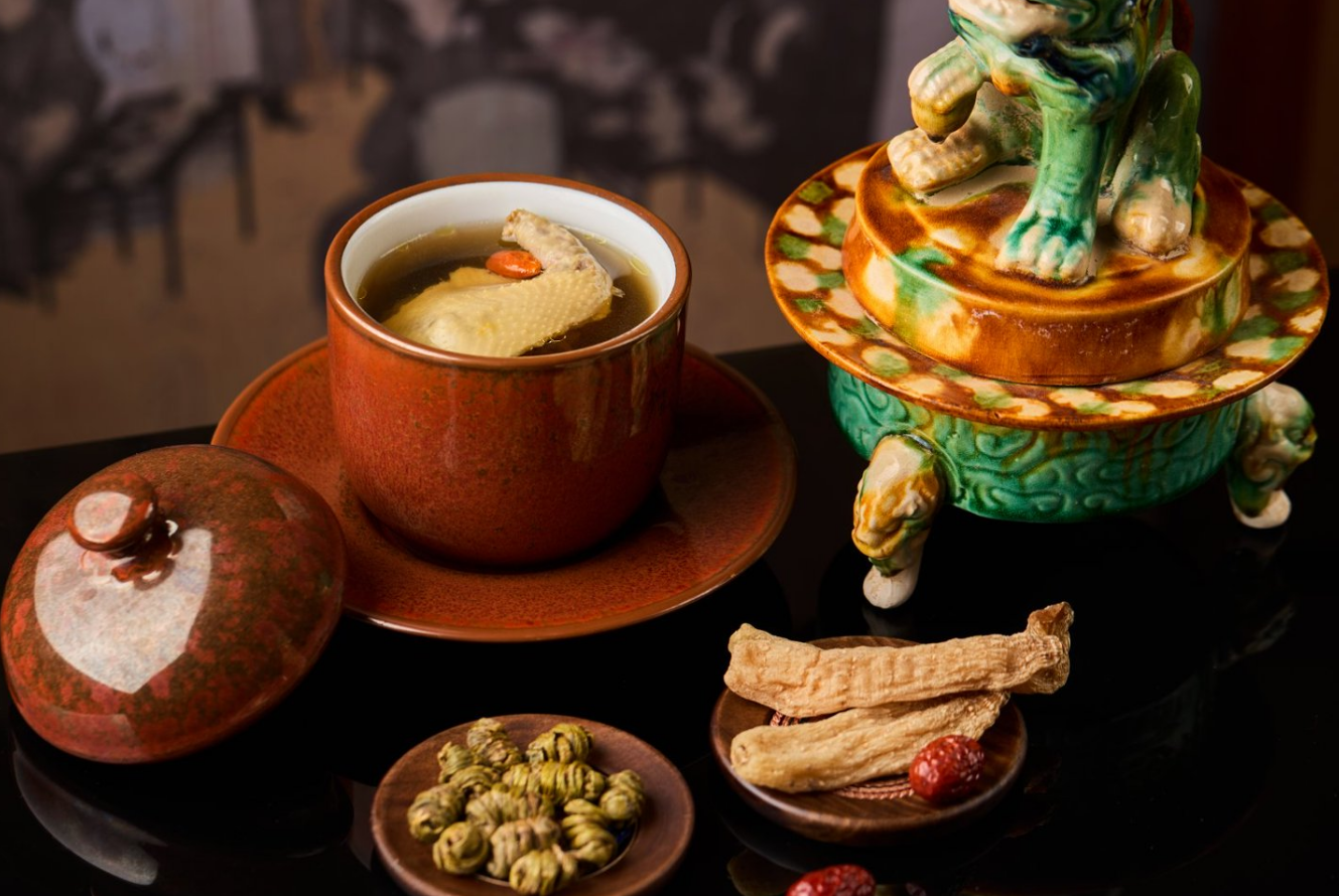 川菜二十四味之“咸鲜味”。养生石斛炖乳鸽,承《鹿鸣》燕乐嘉宾之古意,启冬宴温润和乐之序章。乳鸽肉质细腻,温润不燥,配以猪里脊增其鲜醇;鲜石斛清润生津,天麻平肝息风,大枣补中益气,数味相合,隔水慢煨,使食材精华尽释于汤。汤色澄澈如玉,鸽肉软糯脱骨,石斛微甘萦绕舌尖,宾客于此盏中和五味、养身心,亦在乐声中共赴一场宾主尽欢的和乐之境,体味蜀宴赋“以食为养,以宴载道”的宴饮哲学。