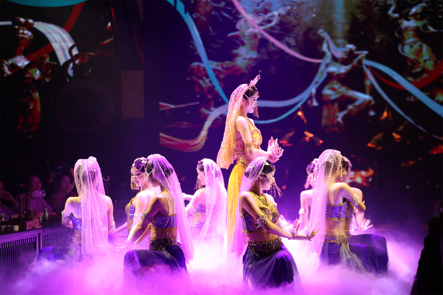 节目诠释:“羌笛何须怨杨柳,春风不度玉门关。”(《凉州词二首·其一》唐·王之涣)公元618年,大唐出使外邦的队伍以长安为起点,穿越河西走廊,以敦煌为中枢连接起了世界历史版图中最为高光的贸易与文化纽带——“丝绸之路”。大唐的丝绸、茶叶、工艺品、文化艺术流入世界各地,南亚、西亚、中亚的朝拜队伍亦鱼贯而入,中西文化的交融在历史画卷中奏响了一阕盛世欢歌。宫廷乐舞《丝路魅影》梦幻重现了盛唐丝绸之路上的文化交融之景。在舞蹈动作的设计上,舞者通过充满异域风情的舞姿,展现丝路文化的幽冥、神秘与魅惑。在互动环节中,舞者通过肢体和表情与观众近距离交流,引导观众进入一个跨越千年的丝路幻境,体验大漠尘烟中的神秘与隽永。雕梁画栋处,风沙幻影间,数名充满异域风情的窈窕女子摇曳生姿,她们从敦煌壁画中飞舞而来,从驼铃声声中翩翩而至,勾勒出一笔东西文化交融的浓墨重彩。