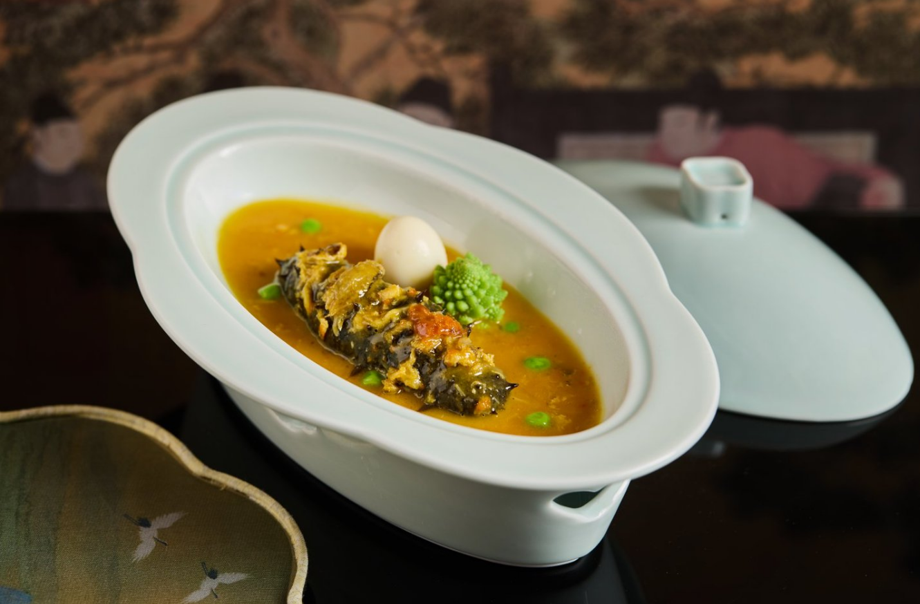 菜品诠释:川菜二十四味之“咸鲜味”。蟹黄酱扣辽参,严选关东辽参,其软糯厚实、胶质丰盈,与以蟹黄、蟹柳秘制而成的咸香金汤一同焖煮,滋味尽数融入。宝塔菜与青豌豆增添一抹清新脆嫩,鹌鹑蛋则赋予醇厚底蕴。蟹黄之鲜醇与辽参之弹润在口中交织,恰似那场洛水河畔的相逢,滋味绵长,是初见时的惊艳,亦是回味时的无限怅惘。一箸之间,品味的不止是山海之珍的融合,更是一段跨越千年、爱而不得的浪漫史诗。