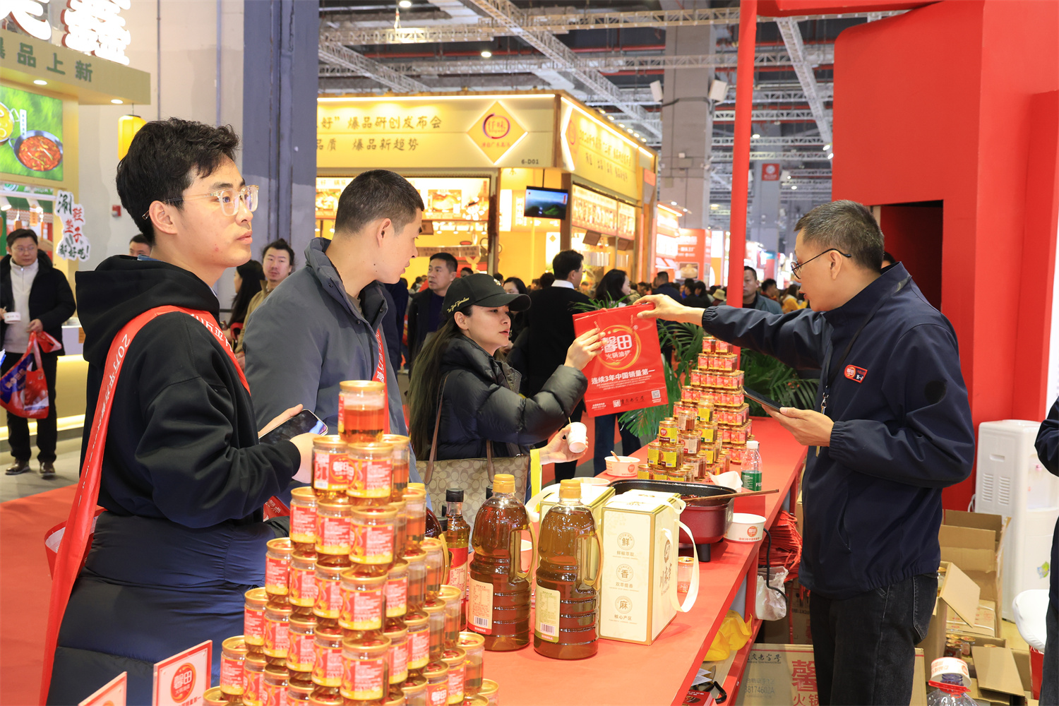 本次展会上,馨田集团匠心打造集产品展示、沉浸式味觉体验、商务洽谈于一体的特色展位,按四大品牌分区呈现。火锅油碟、麻酱、菜籽油、花椒油等全规格产品有序陈列,专业试吃品鉴区人头攒动,让各地客商零距离品鉴产品魅力:馨田火锅油碟香醇绵长、正庭香高香麻酱浓郁醇厚、汪大妈菜籽油地道鲜香、川麻客花椒油劲爽够味,多层次风味体验吸引众多客商驻足洽谈,尽显品牌硬核吸引力。