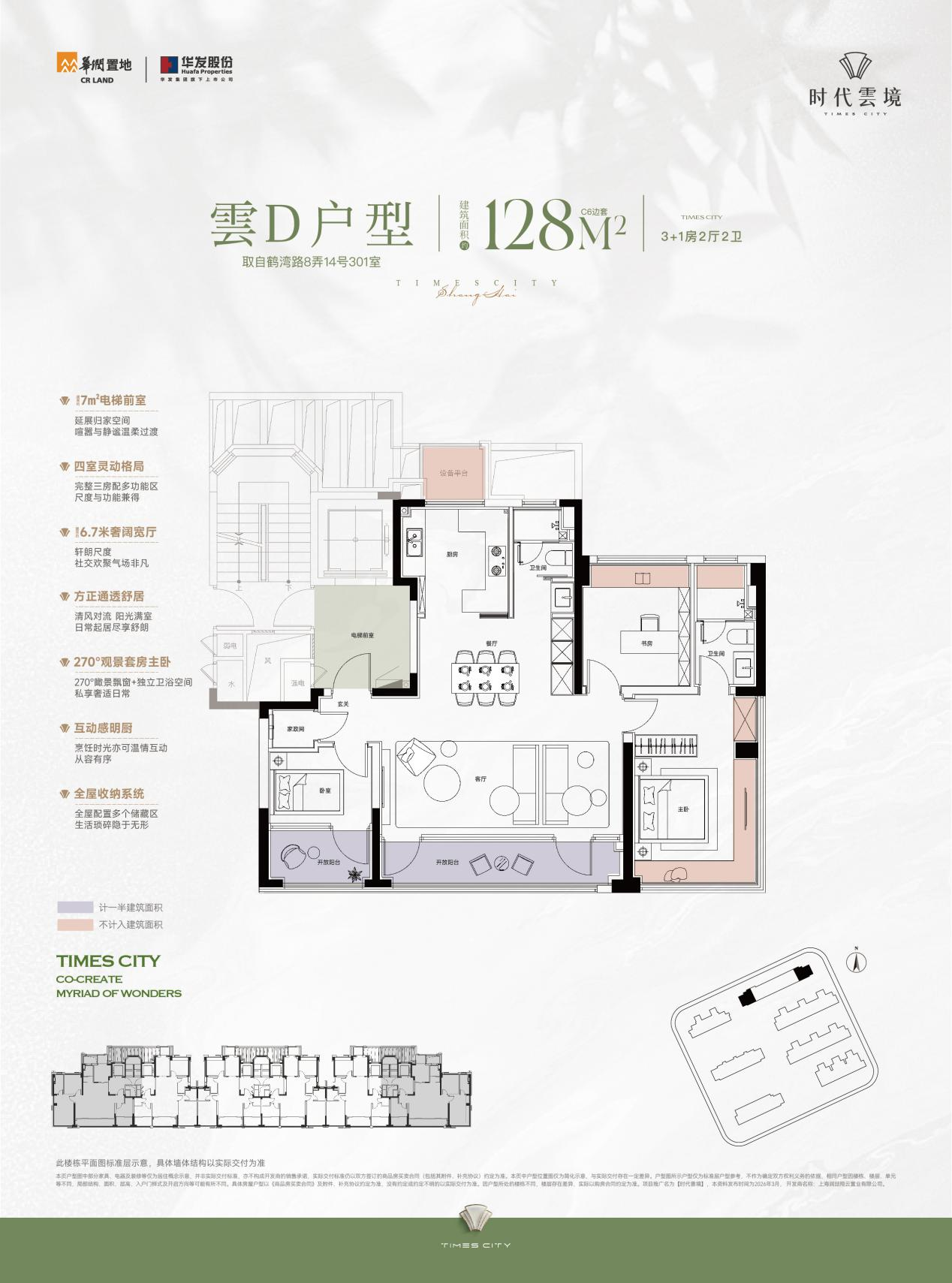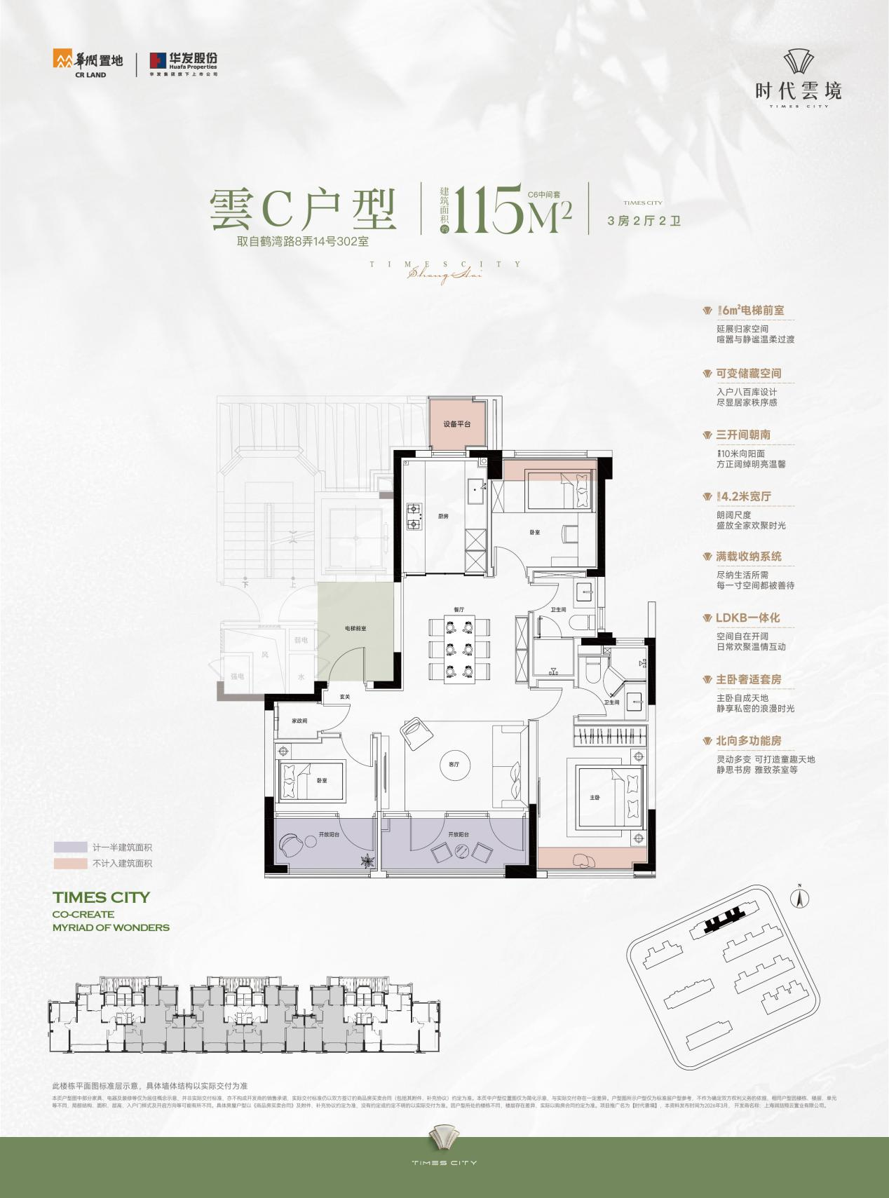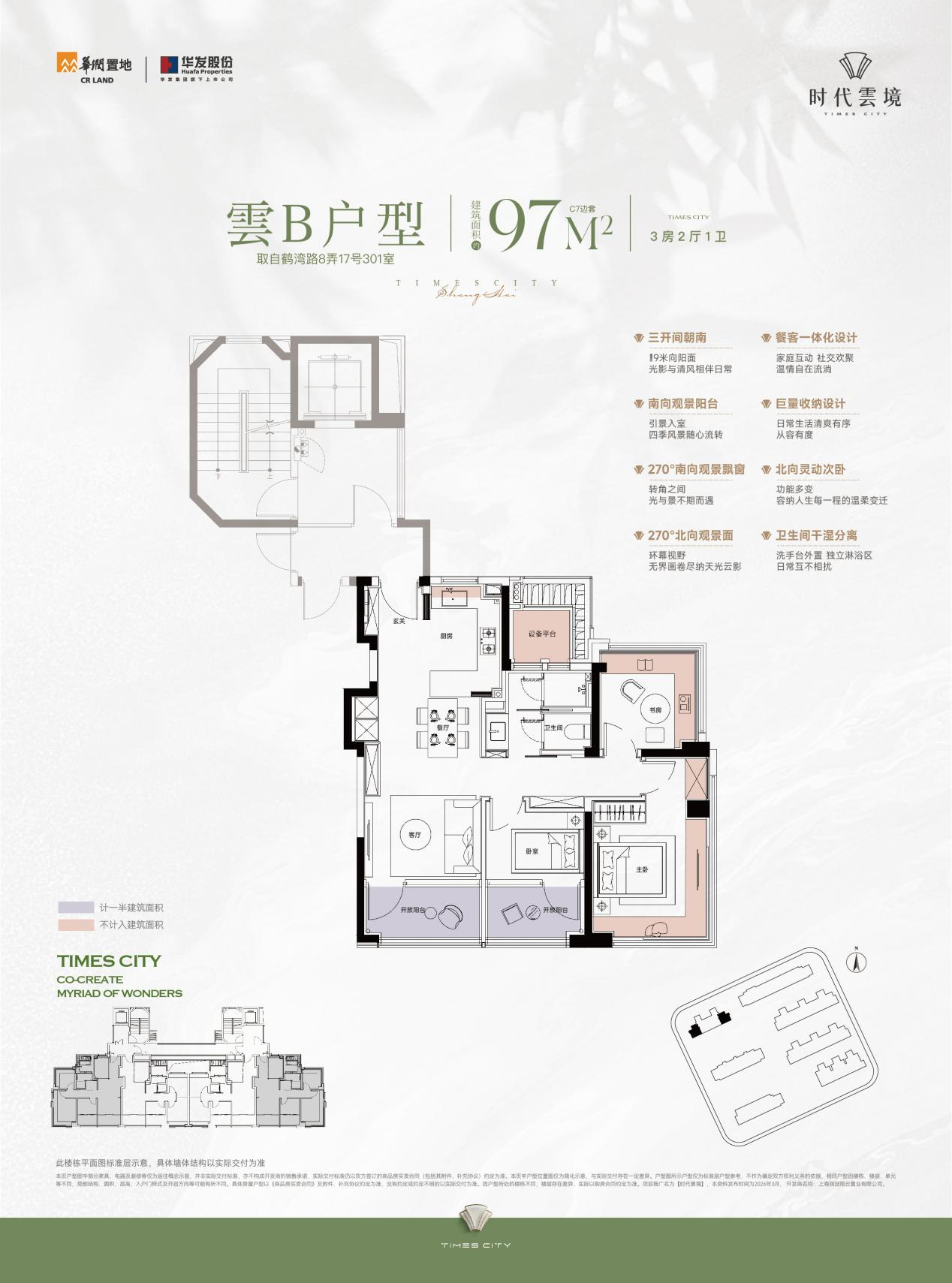 1.本资料内展示的全区景观与实景存在差异,展示的建筑、设施、绿化景观、道路及铺装材质、岗亭、地下空间、周边环境等信息非交付标准,同实景存在差异,且后期可能伴随项目规划调整、城市开发建设进程推进发生变化,最终交付标准以双方订立的《上海市商品房预售/出售合同》及其附件约定为准,2.户型图所示户型仅为标准层户型参考,不作为确定双方权利义务的依据,相同户型因楼栋、楼层、单元等不同,局部结构、面积、层高、入户门样式及开启方向等可能有所不同。具体房屋户型以《商品房买卖合同》及附件、补充协议约定为准,没有约定或约定不明的以实际交付为准。项目推广名为【时代雲境】,本资料发布时间为2026年3月,开发商名称:上海润喆翔云置业有限公司,