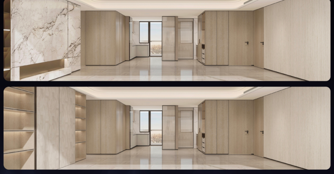 背景墙提供两种方案,一是样板间的高颜值展示款,适配偏爱简约设计的家庭;二是满柜收纳定制款,电视机可移门隐藏,两侧打造整面收纳柜,拉满客厅收纳空间,完美适配小户型储物需求。更让人惊喜的是木饰面 + 地面的定制选择,业主可根据审美偏好,挑选不同的木饰面花色和地面材质。
