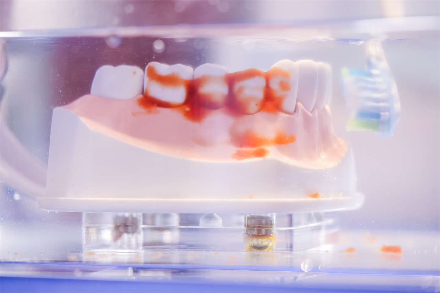 隔水冲刷残渣实验:刷头隔着水层作用于牙齿模型,依然可以迅速分散齿缝中的残渣,体现动力在不同使用角度下的稳定输出;