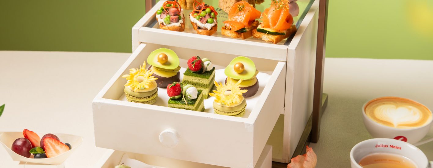 甜品系列包括:牛油果芝士蛋糕,糅合清润鳄梨酱及浓郁芝士,口感丝滑。薄荷巧克力泡芙,内馅蕴藏清凉薄荷奶冻,外层包裹柔滑巧克力,清爽不腻。绿茶慕斯和开心果马卡龙,以精巧造型和细腻风味,为下午茶圆满收尾。