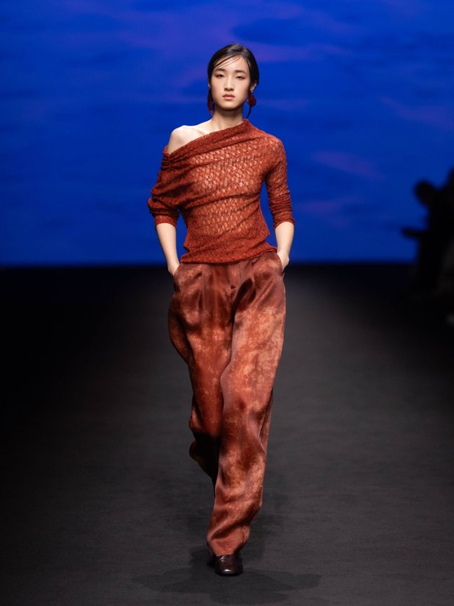 温润而馥郁的土壤成为色彩的基调。儿茶,天然植物染料,为时装系列提供了温润而富有层次的赤褐色调;继而,以夏日赤褐为起点,COMME MOI将自然染色的沉静气质融入设计之中:作为—种历史悠久的天然染色工艺,泥染帮助COMME MOI以更克制、简约的方式去呈现天然染色的不可预期的美妙质感。—组强调细微肌理的针织设计引人注目:创作者尝试采用两种不同纱线进行混织,以营造类似墙面、树皮或土地的自然肌理。