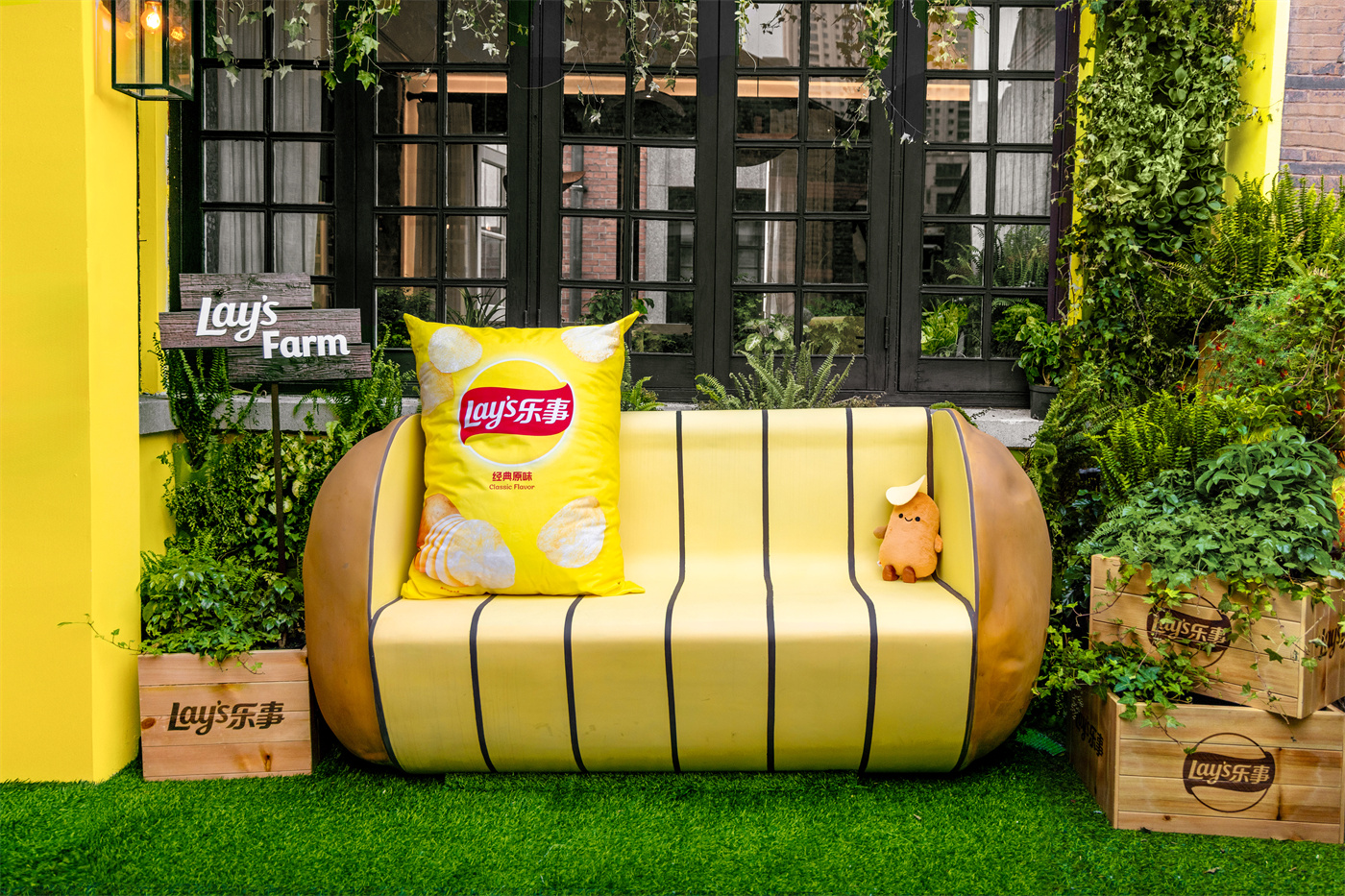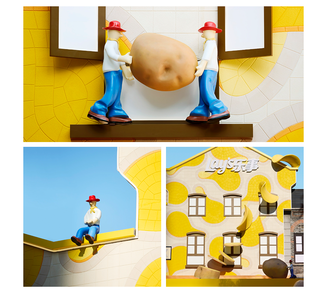 这份先锋美学巧思,更以跨界共创的形态渗透进空间各处。乐事携手时尚设计师品牌8ON8,共同打造极具动态张力的艺术装置:餐厅外立面上,趣味鲜活的小人形象,生动演绎着从土豆到薯片的奇妙转变。他们或搬运土豆或惬意休憩,仿佛为这场土豆盛宴奏响欢快序曲,自然引领食客开启美味探索之旅。