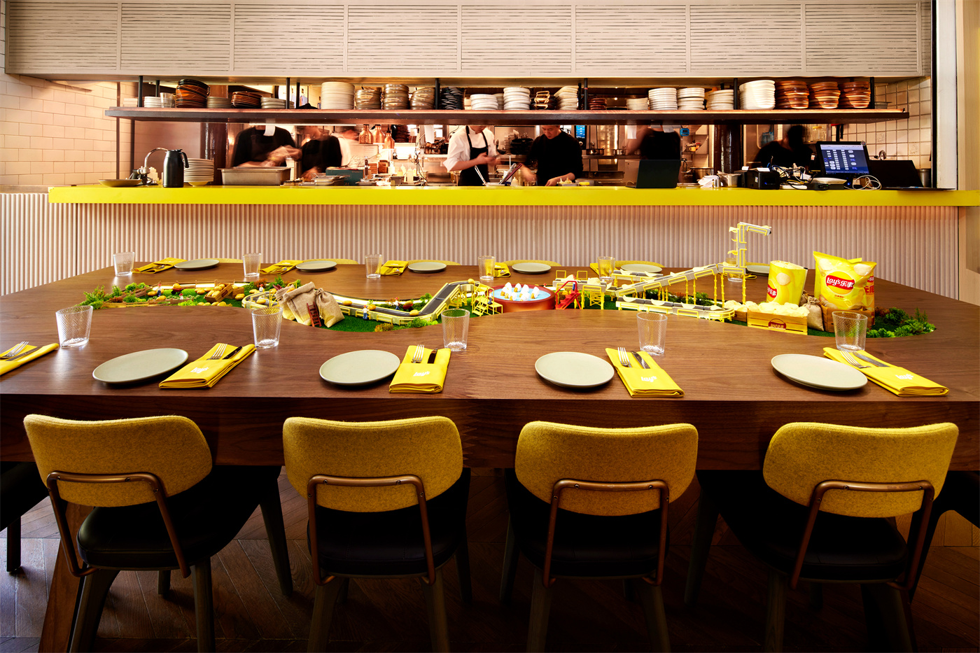 拾级而上,二楼更把“从农场到餐桌”的叙事层层递进:餐桌上,宛若沙画艺术般的微缩景观徐徐展开,土豆从农场到工厂最终成为乐事薯片的旅程都清晰呈现。推门而出,阳光充沛的农场露台与隔壁自然主题包房相映成趣,让食客在享受美食和打卡拍照的同时,感受品质食材的本真魅力。