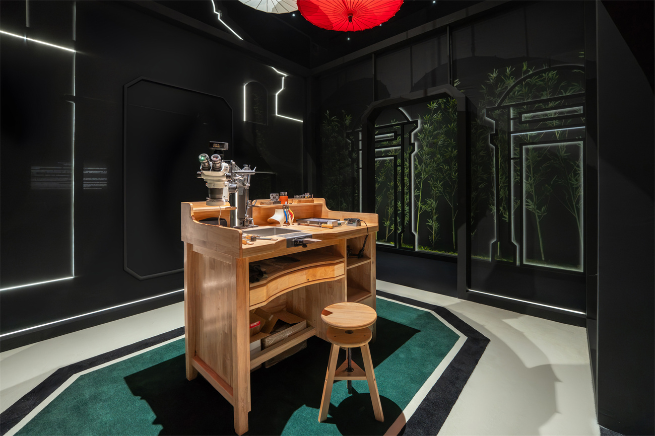 整场旅程的最后一个空间,通过光影通透与层次叠映的设计,逐步为宾客们揭示了新天地与芳登广场之间的对话,也展现出菲德烈克·宝诗龙之精神跨越时空与国界的延续。新天地旗舰店的轮廓首先映入宾客们的眼帘,随后引领他们漫步其中。空间中央,是对芳登广场珠宝工坊的生动再现:一张工作台前,来自宝诗龙巴黎工坊的工匠现场演示着问号项链的创作过程。屏幕上亦呈现由全球品牌代言人肖战与周冬雨出演的全新双集广告影片,他们生动演绎了芳登广场与新天地之间的深厚联结。更有短片聚焦为新天地旗舰店倾注心血的匠人与艺术家们,致敬这座全新地标背后匠心与才华的凝聚。