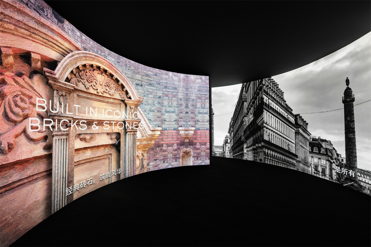 首个沉浸式空间确立了整场体验的核心。弧形墙面上投射出芳登广场与新天地街区的典藏影像,在两处承载着深厚历史底蕴与标志性建筑风格的文化街区之间,构筑起一场穿越时空的对话。