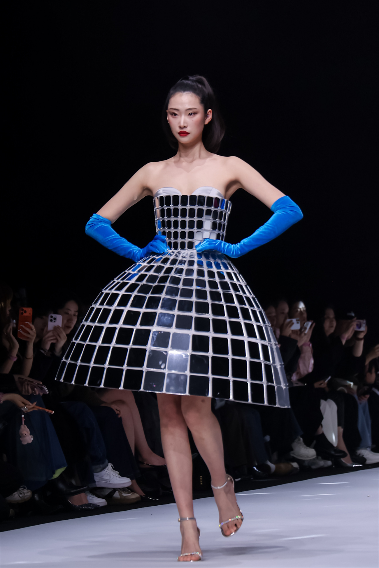一如白日中的灯球,并非以强烈光芒夺目,而是在细碎光线中持续反射,呈现出更真实、更复杂的光泽层次。设计师向逸精妙地从灯球“日常中的炫彩”出发,将碎光的切面感、流动光泽与女性的多元气质一一映照,将其转化为具有结构张力与层次变化的设计语言,展现女性在不同语境中斑斓丰沛的生命能量。与此同时,她还特别将视角引入最琐碎的时间碎片 —— 置礼服于那些被通勤、工作、社交与独处不断切换的时刻,让女性随时随地都能呈现出丰富又独特的个人魅力,传递出“平凡亦有高光”的深刻理念。